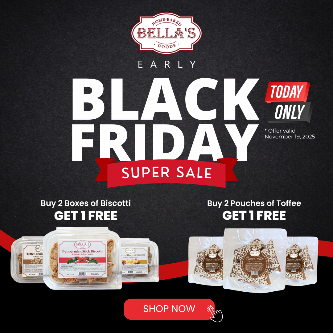 At Bella’s Home-Baked Goods we create only the finest authentic Italian biscotti, hand-poured butter toffee, and old-fashioned cookies and brownies. Each is made with love and attention, one batch at a time, using only the best ingredients with no added preservatives.